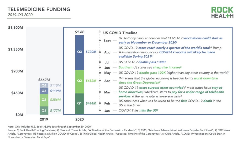 I finanziamenti per le aziende che offrono servizi di telemedicina, in particolare, hanno registrato un aumento significativo (più del doppio) dal 1° al 3° trimestre del 2020 rispetto al 1° trimestre del 2019.